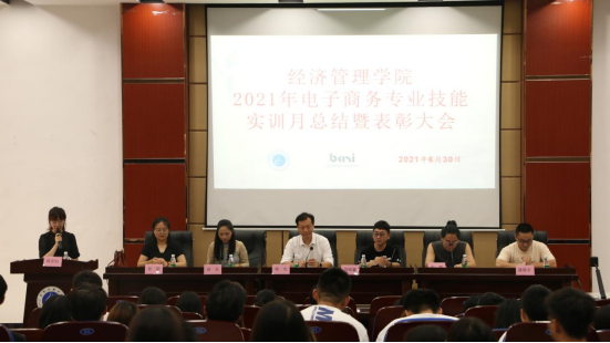 2021年6月30日上午10点,pp电子官网在明德楼先圣厅召开2021年电子商务技能实训月总结暨表彰大会,学院党总支书记喻忠、重庆暴痴网络科技有限公司董事长刘雨鑫、副经理汤东、运营经理兼实训指导老师何博、电商物流教研室主任徐娟,老师蒋星怡、潘维宇等7名出席会议。到会的还有19级电子商务1班,20级电子商务1、2班全体同学。会议由蒋星怡老师主持。