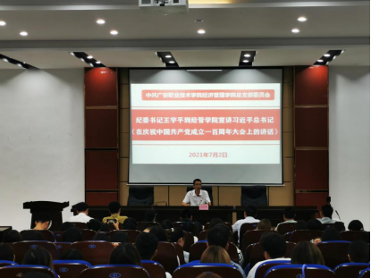 7月2日下午,学校党委委员、纪委书记王宇平在明德楼“先圣厅”为经管学院师生讲党课。王宇平围绕学习贯彻习近平总书记在庆祝中国共产党成立一百周年大会上的讲话精神,加强党史学习教育,加强学校党风廉政建设,严明纪律规矩进行专题宣讲。会议由经济管理学院党总支书记喻忠主持,经管学院师生代表100余人聆听了宣讲。