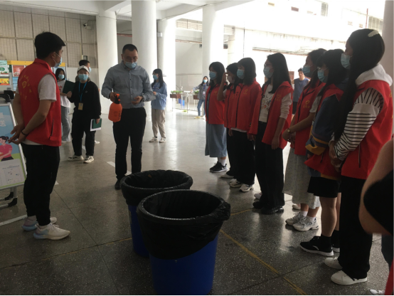 培训结束后,郭书记带领志愿者们来到校园快递超市,详细的说明了疫情防控志愿者服务流程并亲自做了示范,比如劝导师生正确佩戴口罩、如何使用消毒喷壶给快递及公共区域的环境消杀等。