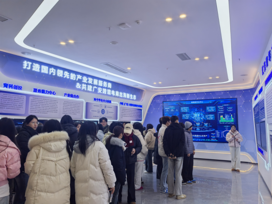 随后,师生前往广安跨境电商公共服务中心,依次参观数字展厅、轻链孵化园区及本地产品展示中心。通过动态数据展示与园区导览,同学们对跨境电商的运营模式及地区产业发展现状有了系统认识。慧贸天下研究院专家围绕行业发展趋势与人才需求进行分享,为学生今后的专业学习与职业规划提供了清晰指引。