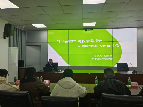 在培训进程中,姚懿菲副教授凭借其丰富的行业经验进行深入分享,并设置互动环节充分调动学员积极性与参与感。培训结束后,参训人员一致反馈收获满满,不仅自身礼仪素养得到显著提升,也为后续研学旅游工作的顺利开展奠定了坚实基础。此次培训活动为推动广安市研学旅游行业服务品质提升发挥了积极作用,也促进了院校与地方研学旅游领域的交流合作与协同发展。