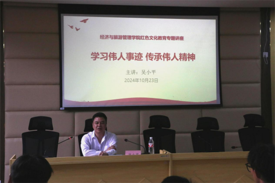 为进一步深化红色文化教育,激发学生爱国热情,pp电子游戏平台网站于2024年10月23日在九思楼培训厅举办了主题为《学习伟人事迹 传承伟人精神》的红色文化教育专题讲座。讲座由pp电子游戏平台网站党总支书记吴小平主讲,学院部分教师和2024级学生参加了活动。