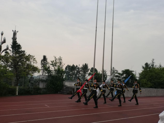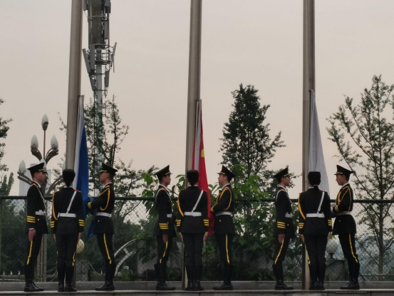 仪式开始前,全体人员在足球场集合,迎接国旗队升国旗,同学们面向国旗排列成整齐的队伍,国旗队庄严整齐的从我们面前昂首挺胸走向升旗台。伴随着国旗队嘹亮的口号,升国旗仪式正式开始,全体同学行注目礼,伴着耳畔的国歌声、校歌声,冉冉升起了国旗、校旗和院旗,整个校园庄严肃穆。